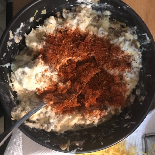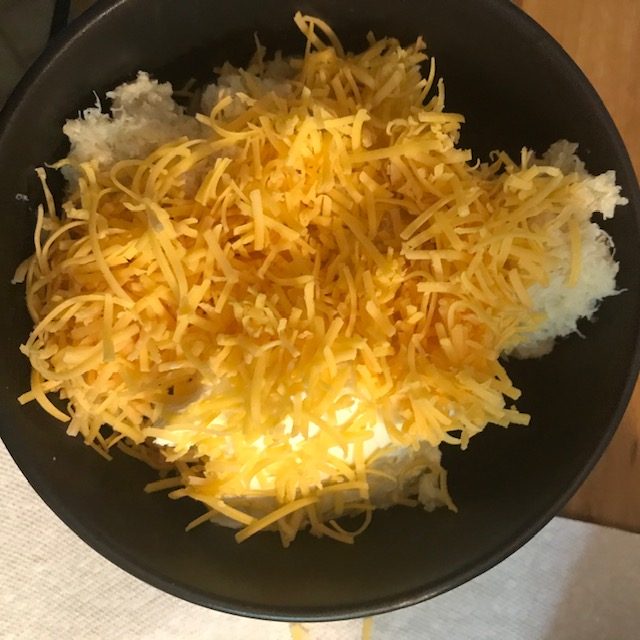 - Add the seasoning and ½ the shredded cheddar cheese to the cream cheese and mix up with a fork.