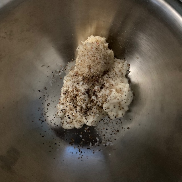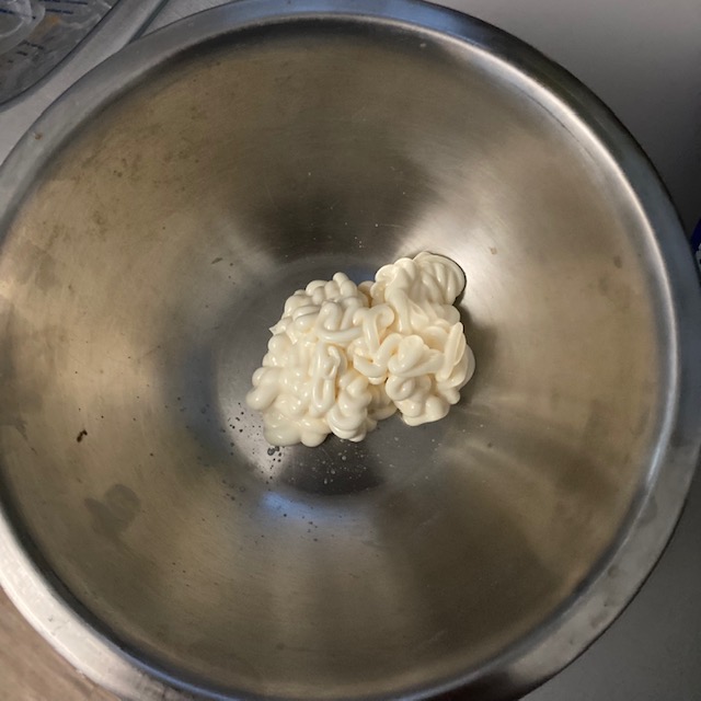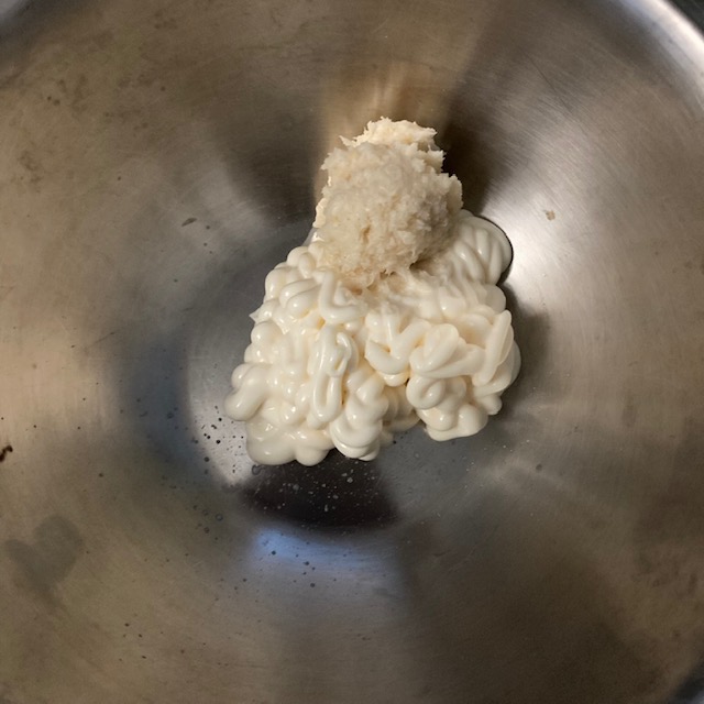 - In a small bowl put in your Mayonnaise, Horseradish, Salt, and Pepper.