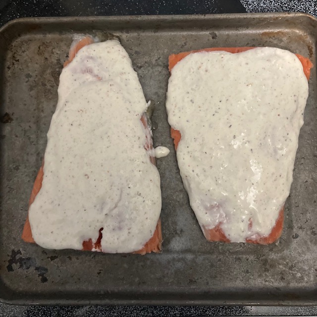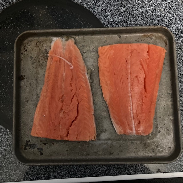- Take your Salmon Filets and lay them on the cooking sprayed baking sheet.