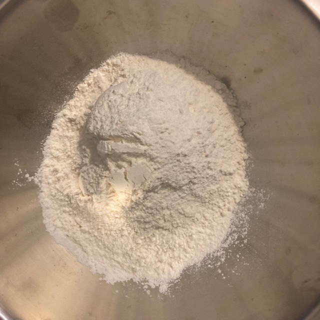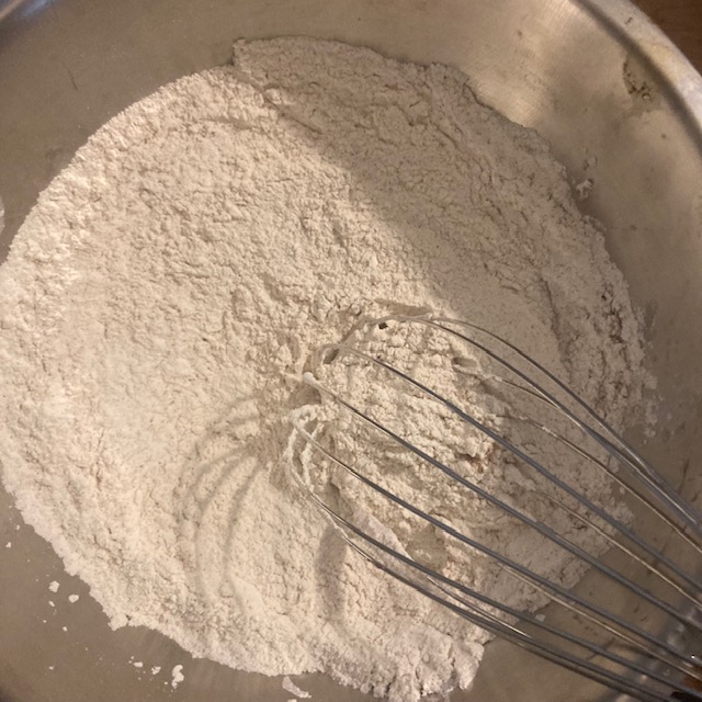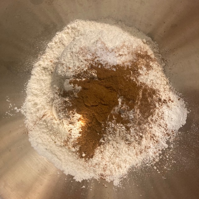 - Get out 2 large bowls. In one bowl put in all the dry ingredients and use a whisk to combine all of the ingredients. (Flour, Baking Powder, Ground Cinnamon, &Salt)