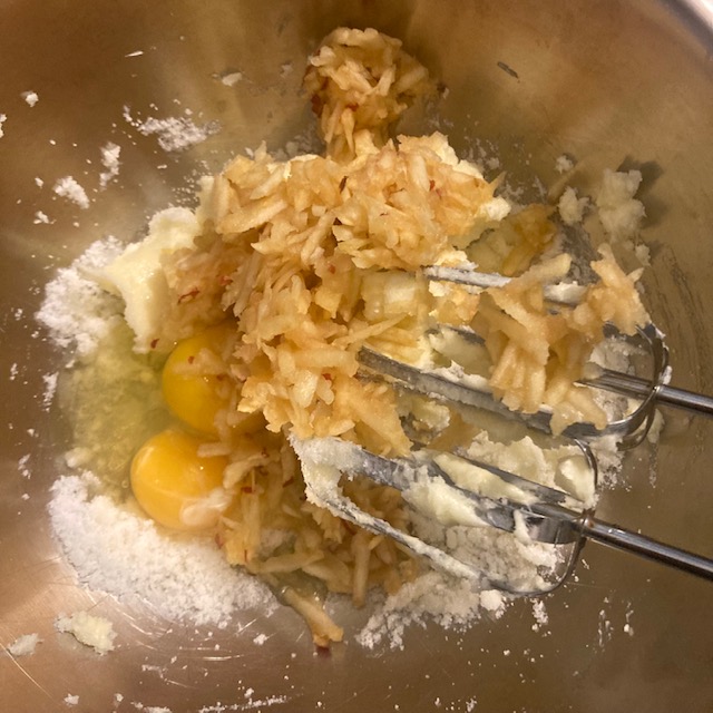 - Now in the second bowl cream the butter & sugar together. Add in the eggs and a graded apple. Mix these very well.