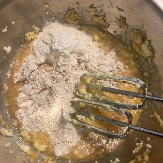 - Add in the Apple cider and the other half of the dry ingredients. Continue to mix with the hand mixer.