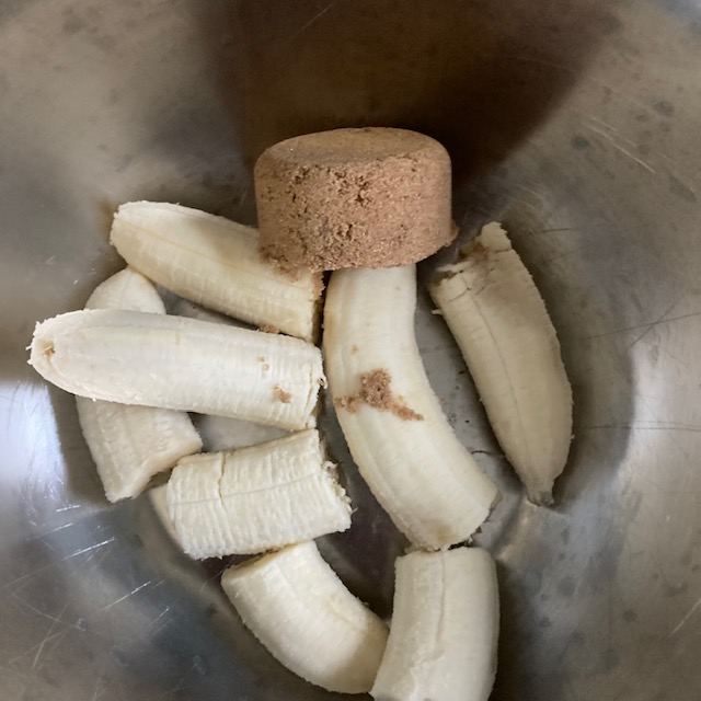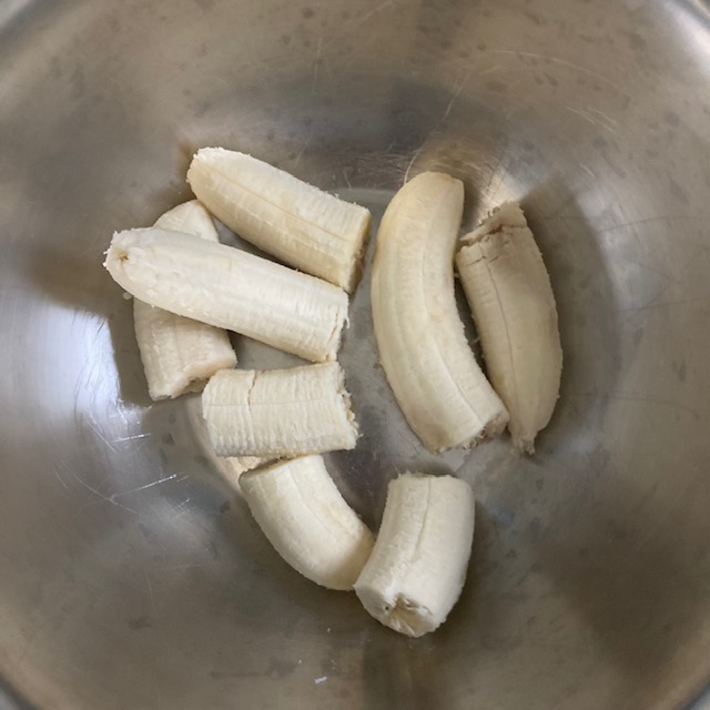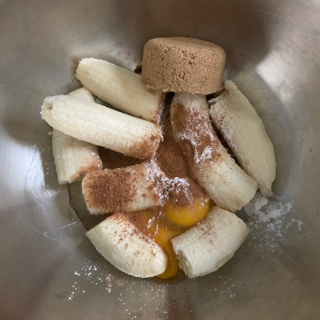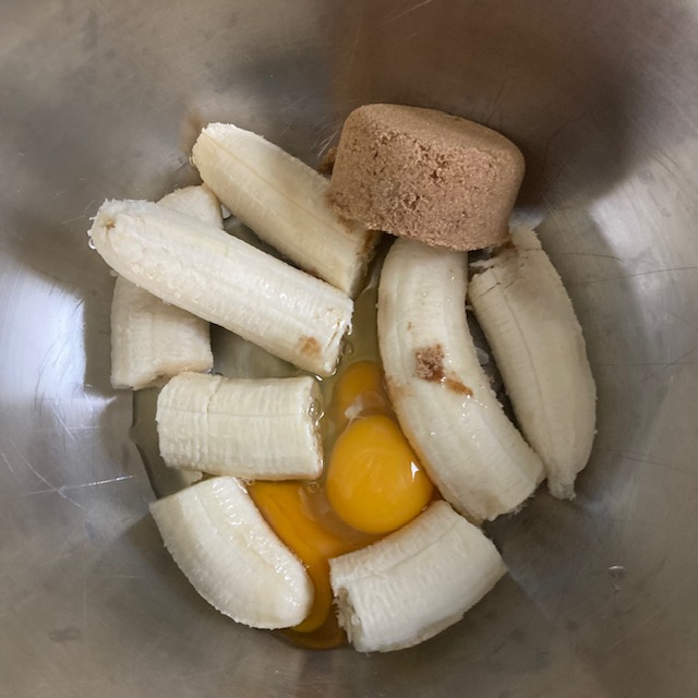 - Peel the bananas and add them to a large bowl with the brown sugar, eggs, salt, vanilla extract, Baking Powder, Cinnamon, & Nutmeg.