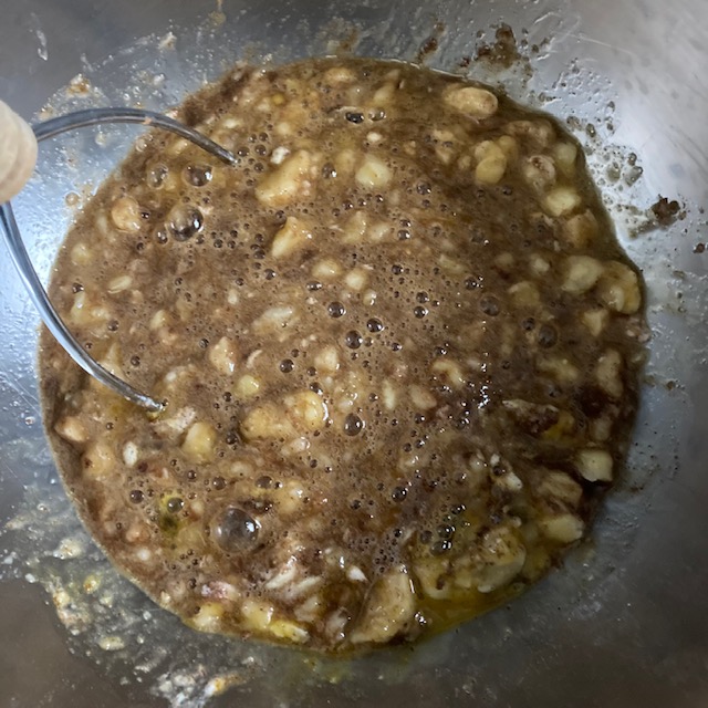 - Use a potato masher to mix and mash up the bananas and ingredients.