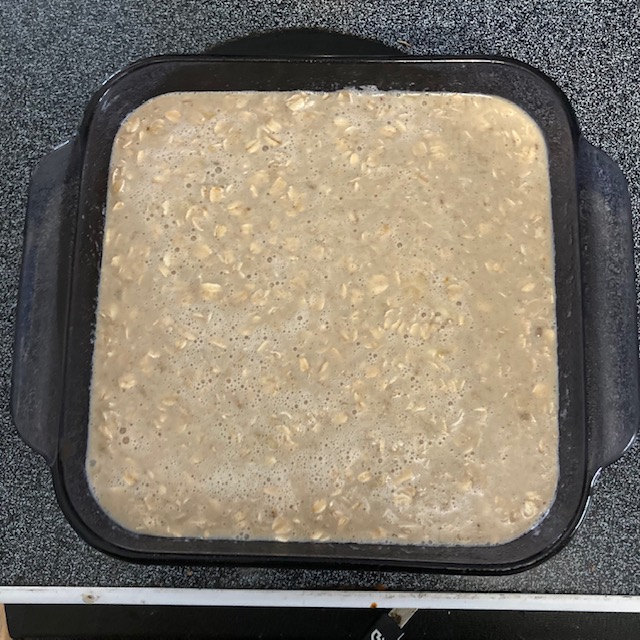 - Spray an 8 by 8 pan with cooking spray and pour in the mixture from the bowl.