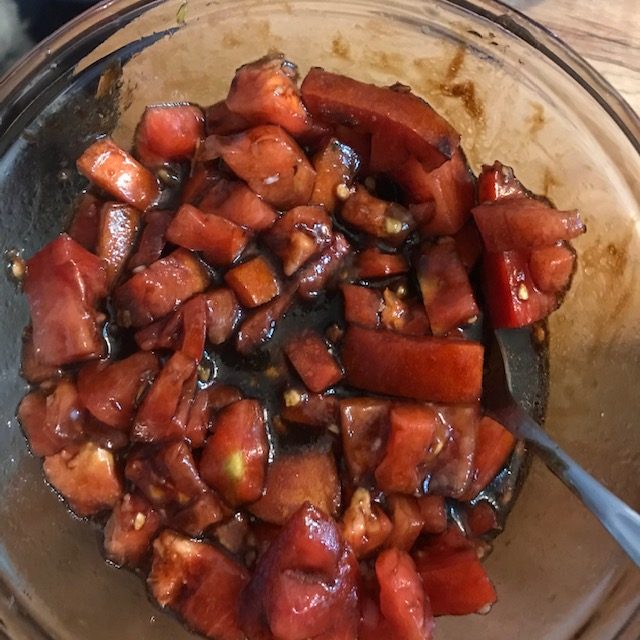 - Add a ¼ cup of the Oil along with a ¼ cup of the balsamic Glaze. Mix all of this together and let it sit for several minutes so that the flavors mesh together.