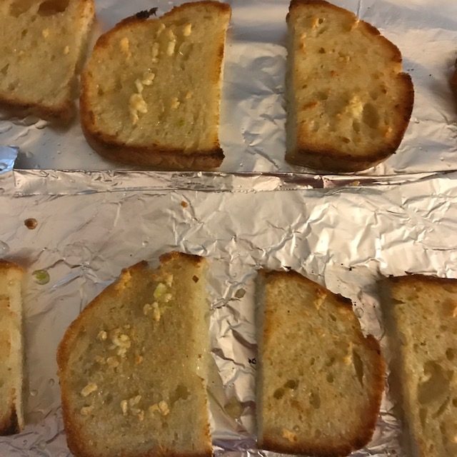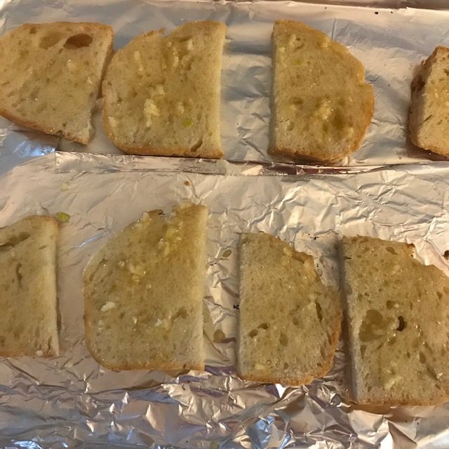 - Brush the Oil Garlic Mixture on to the bread that is spread out over a baking sheet.