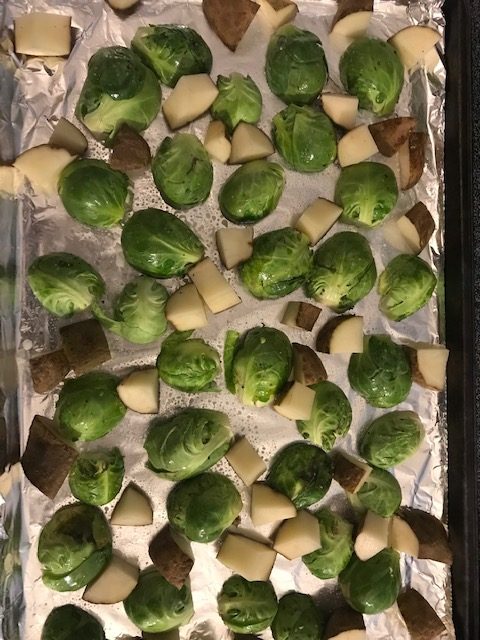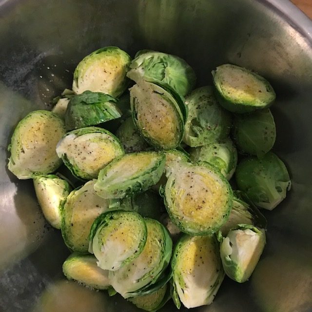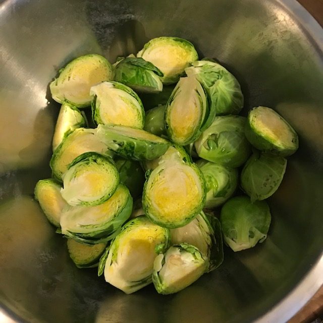 - Trim Brussels sprouts, cut the bottom, and then cut them in half. (Refer to pictures for a general idea)