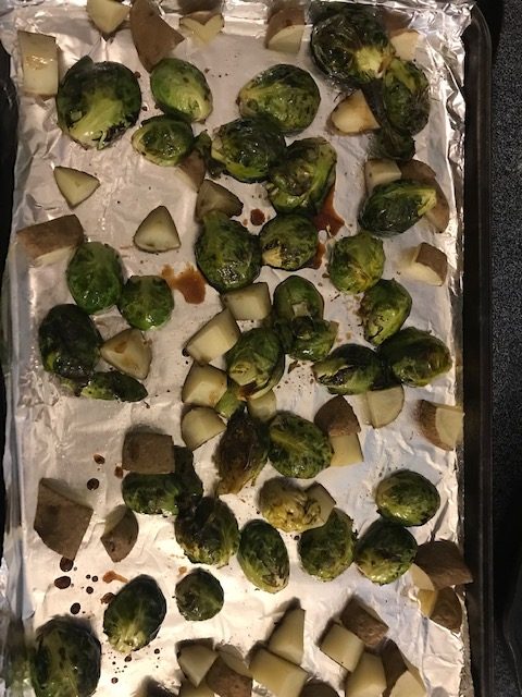 - Remove from the oven place back in the bowl. Add in the other half of the olive oil, the balsamic glaze, and honey. Toss to coat.