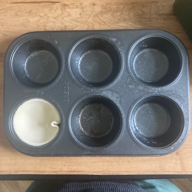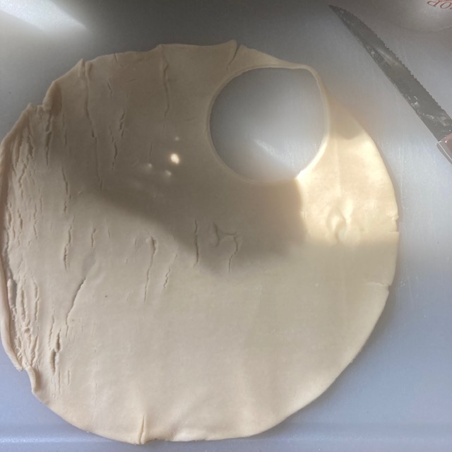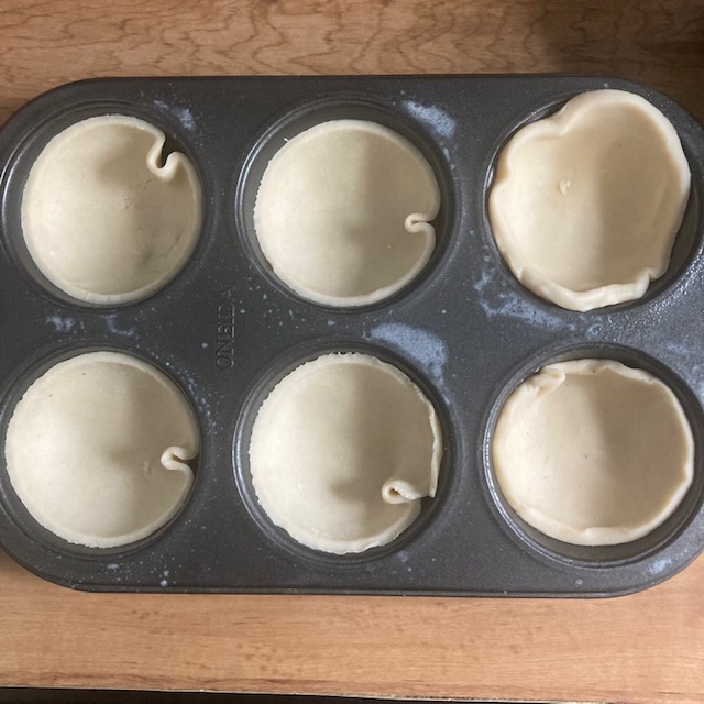 - Use a cup to cut out a circle from your pie crusts. Use a roller to make the circles a little larger and add them to the muffin tin.