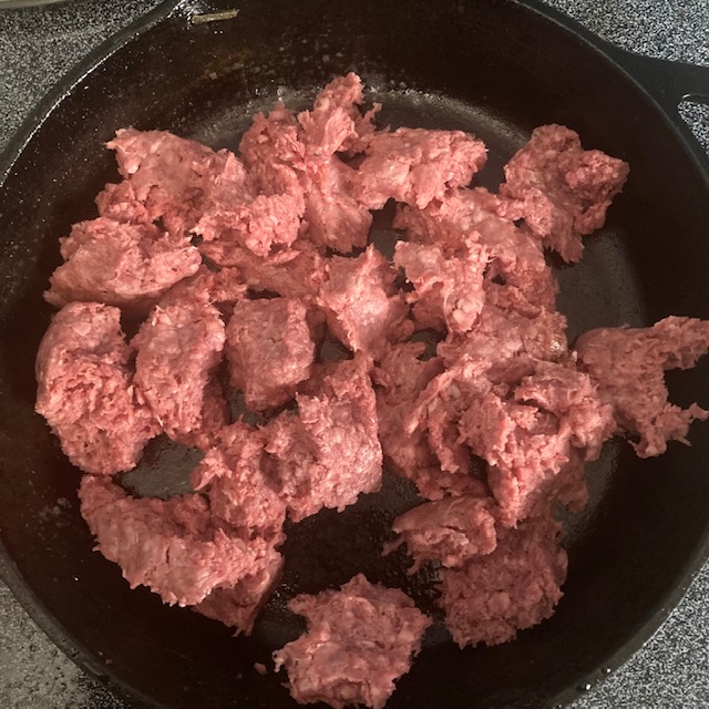 - In a pan over medium heat cook your ground beef.