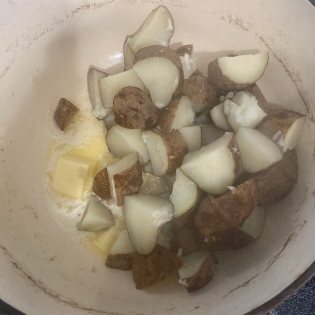 - Drain the water off the potatoes return to the stove and add the butter & minced garlic.