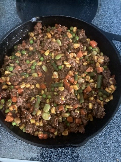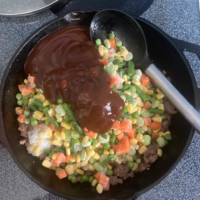 - Once the Beef is browned drain off a little of the juice and then add the vegetables and BBQ sauce.