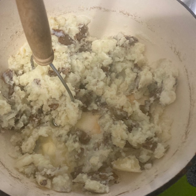 - Mash the potatoes up and add a ½ cup to a cup of milk until you have mashed potatoes.