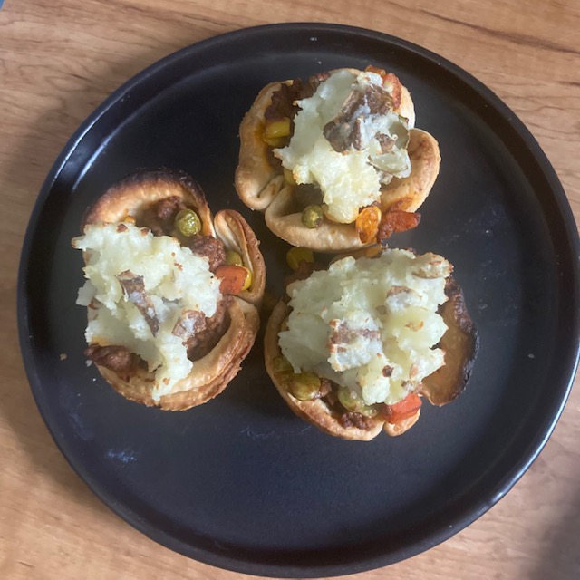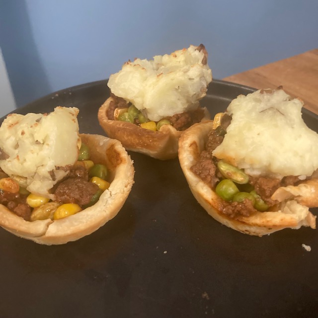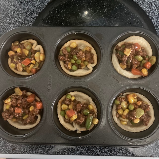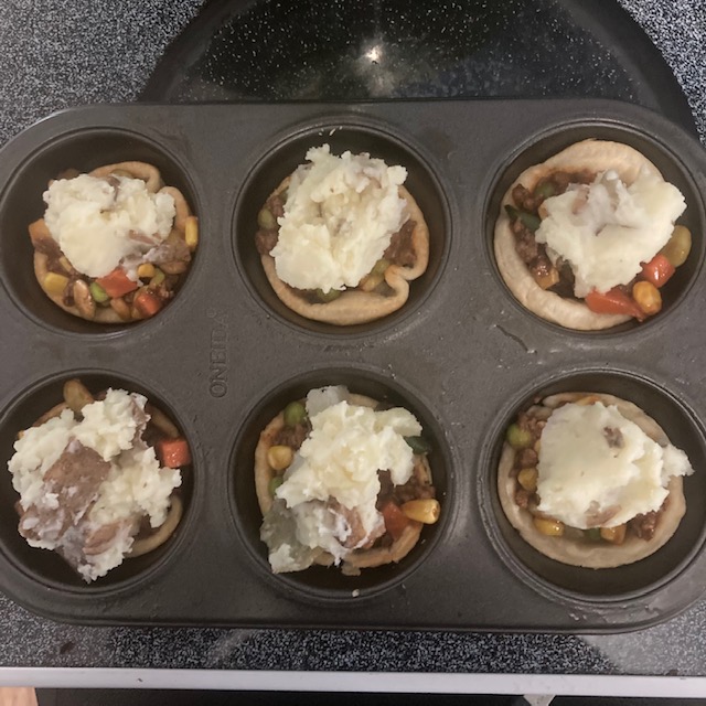 - Spoon the beef mixture into each Muffin pie and then top with a spoonful of the mashed potatoes.