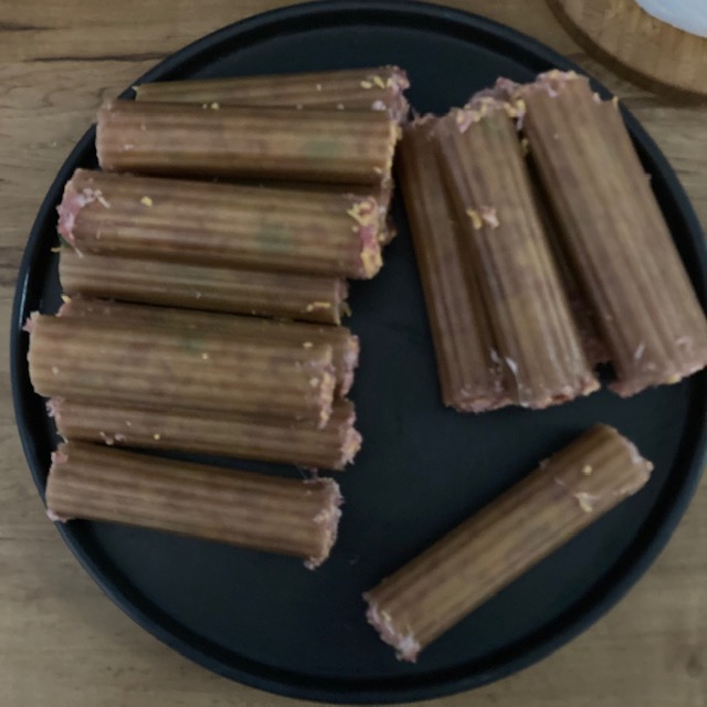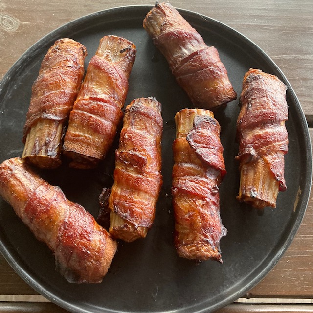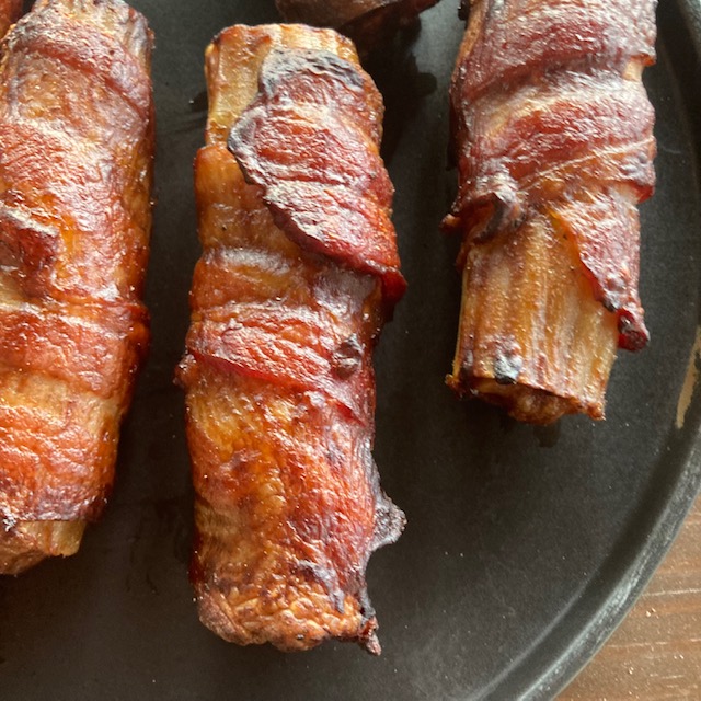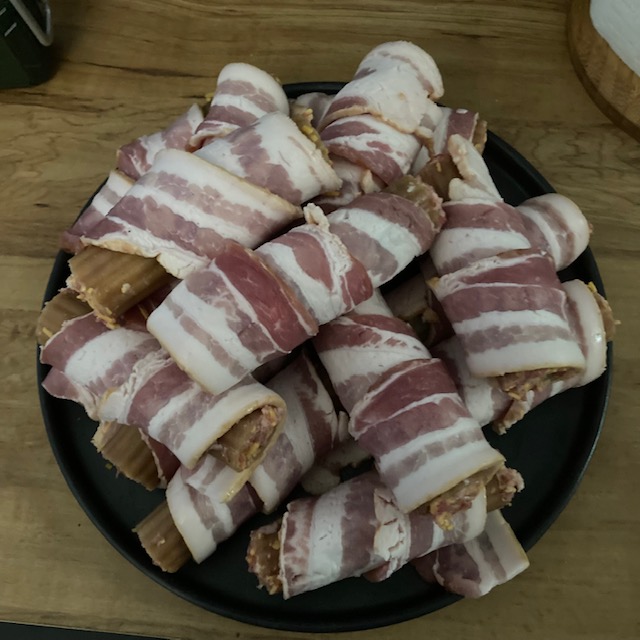 - Wrap each of the Sausage filled Manicotti Shells with a slice of Bacon.