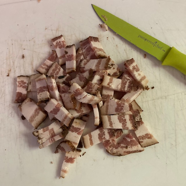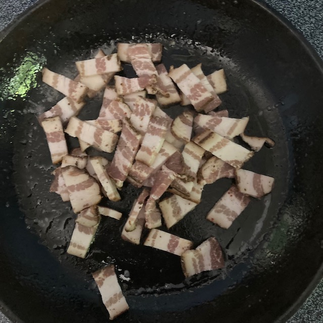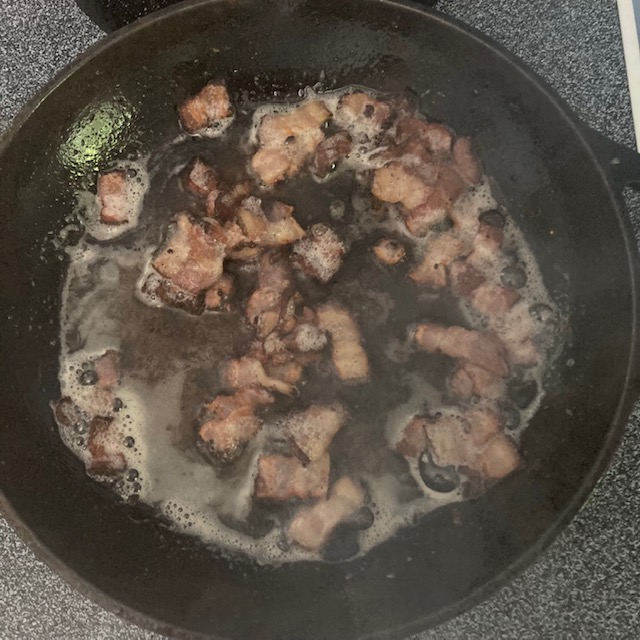 - Chop up the bacon into smaller pieces and cook them over medium heat in an oven-safe skillet. I used a Cast Iron Skillet because, in my opinion, they are the best.