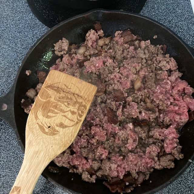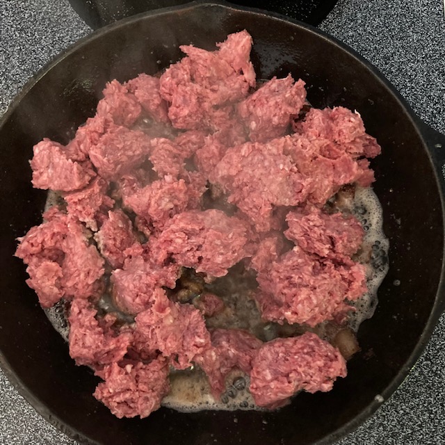 - Break up your Ground Beef and add it to the pan after the bacon becomes crispy.