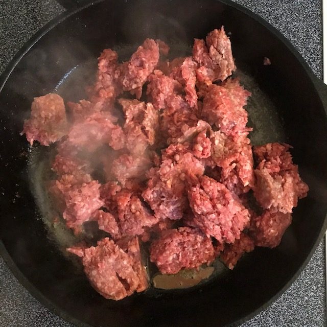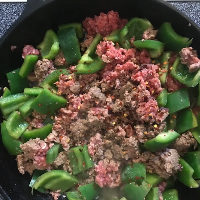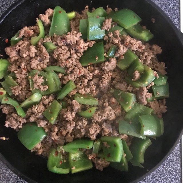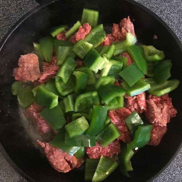 - Dice up the Green Bell Peppers into large man size bites. And then Brown the Beef in the skillet with your Peppers.