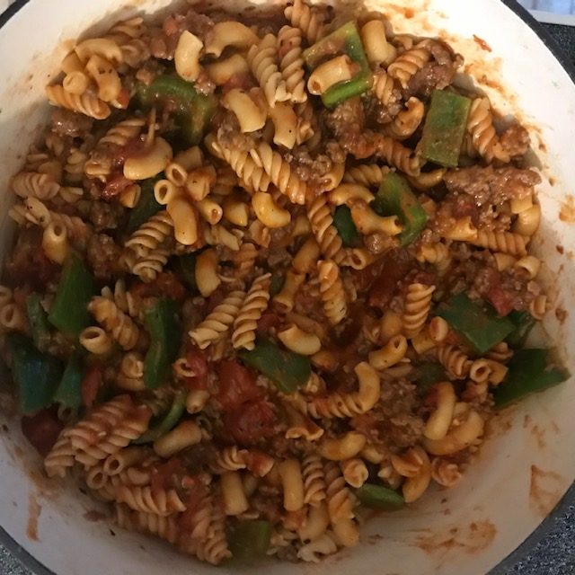 - In a large pot mix together the pasta, meat mixture, can of tomatoes, & the Marinara sauce. Mix this well over medium-low heat. You are basically just heating up the sauce and mixing up the flavors here.