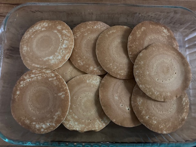 - Place the 12 Pancakes on the bottom of the pan.