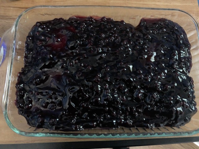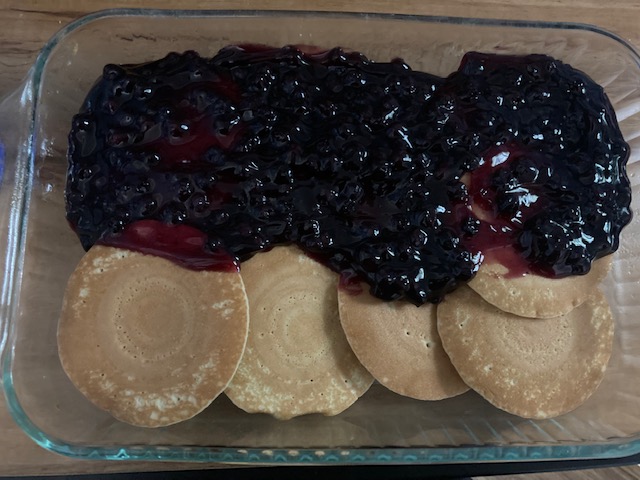 - Dump and spread the Blueberry Pie evenly Filling over top of the pancakes.