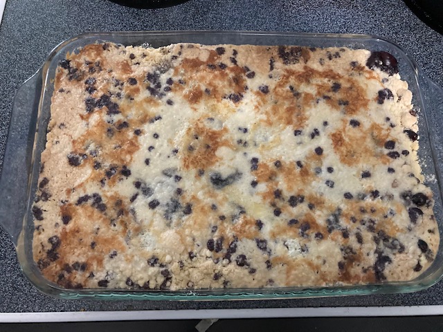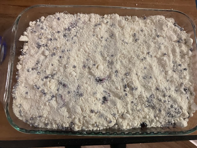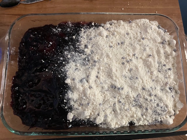 - Sprinkle one box of Jiffy blueberry mix over half of the pan.