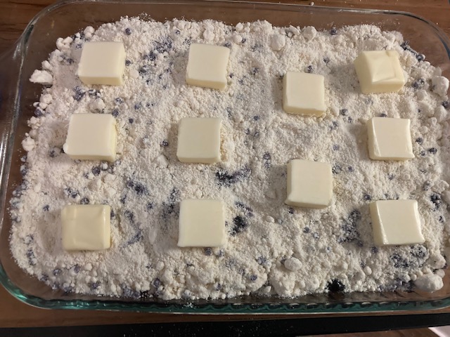 - Now cut up a stick of butter into 12 even pieces and place them on top of the Blueberry Mix.