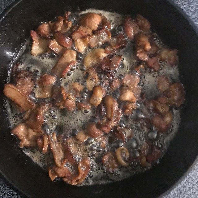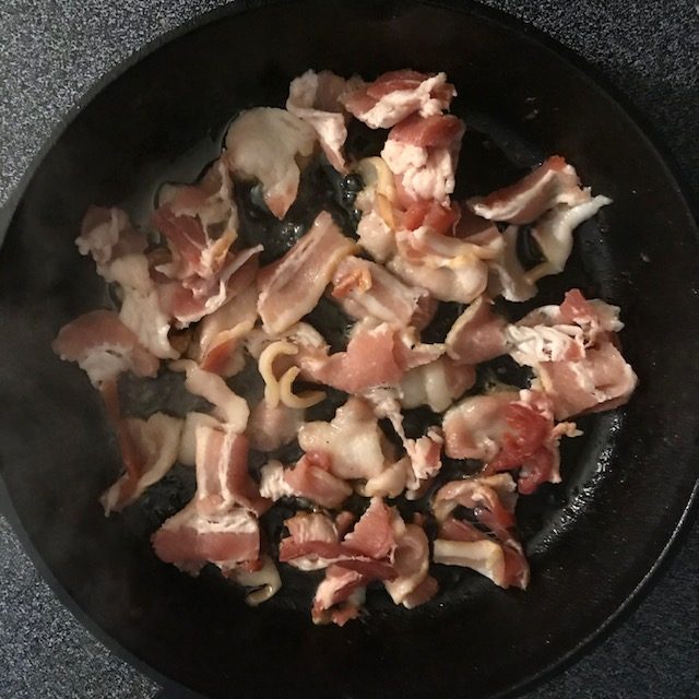 - Cut up your bacon or crumble up your breakfast sausage and cook it in a pan over medium heat.
