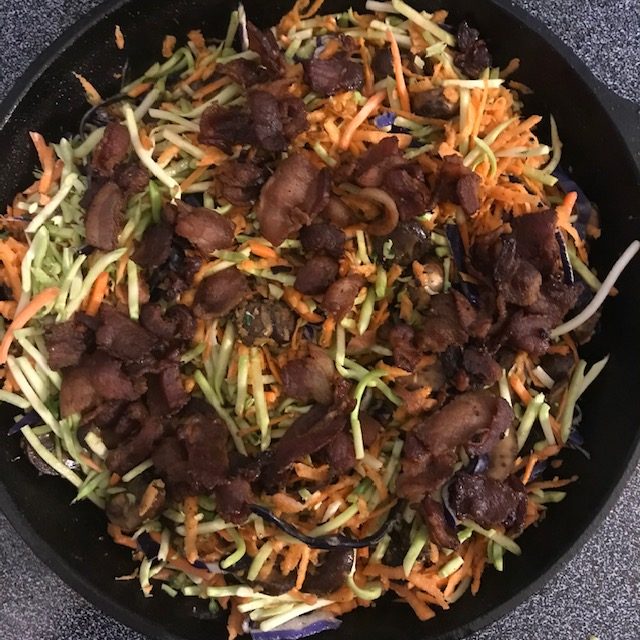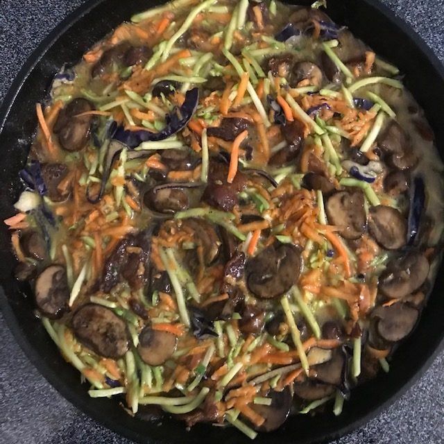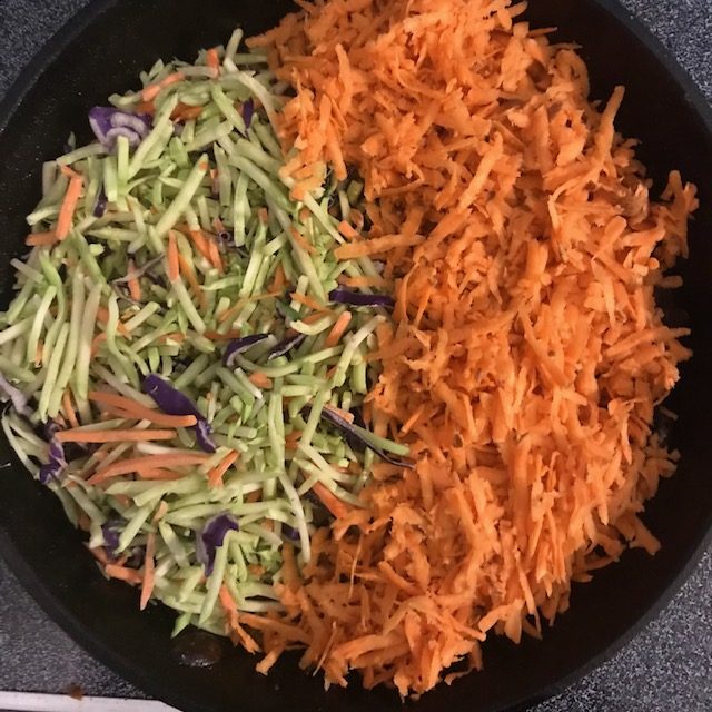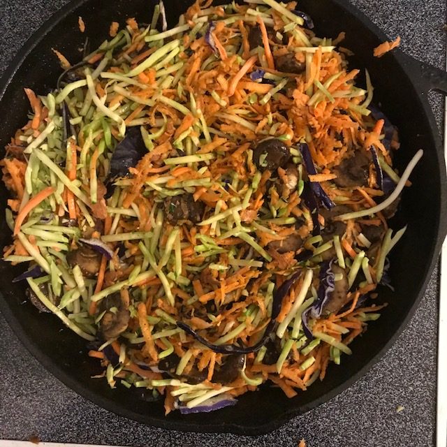 - Add the Broccoli Slaw and the Grated Sweet potato to the Mushrooms. Mix it all together in the Skillet.