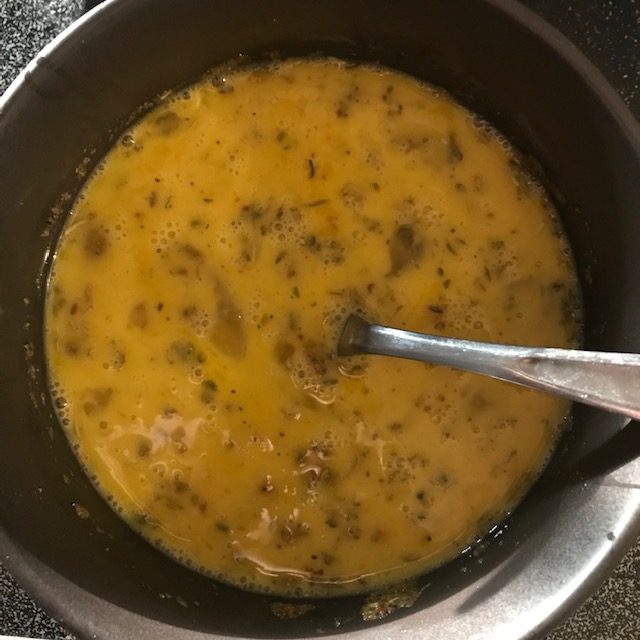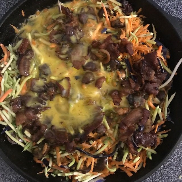 - Pour the Eggs over the rest of the ingredients in the Skillet or 9 by 13 pan.