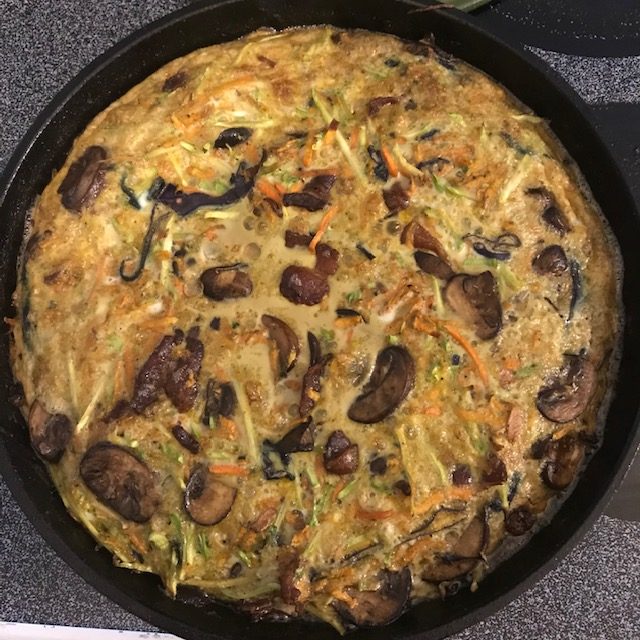 This recipe came to me very quickly after I say a couple different healthy scramble type breakfasts and bakes. I took what I think are the best parts and created this Broccoli Slaw Egg Bake! I added some mushrooms and decided to add breakfast meat. In this instance I used bacon, but a nice breakfast sausage would also work well with this one. I also made this in a cast-iron skillet, so that I could cut them into pie-shaped servings. However, you could easily use a 9 by 13 pan both of these you can get through my shop! The main inspiration for this recipe is from a CrossFit athlete named Cole Sager and his Sager Scramble. You can check it out here on YouTube.