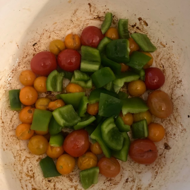 - Add the grape tomatoes and one chopped bell pepper and let them cook for about 2 minutes in the pot. You are looking to get some color on the tomatoes.