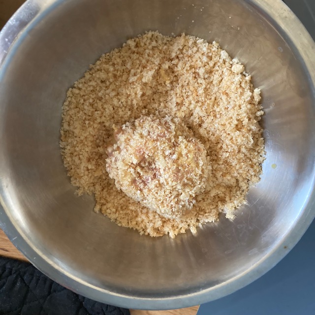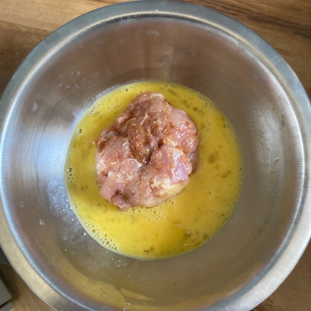 - Now take the nuggets out of the freezer and dose each one in egg and then the pork rinds.