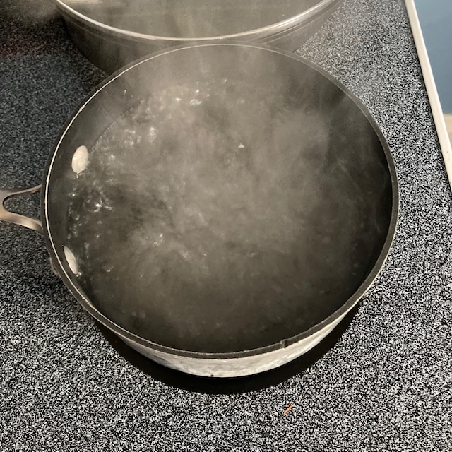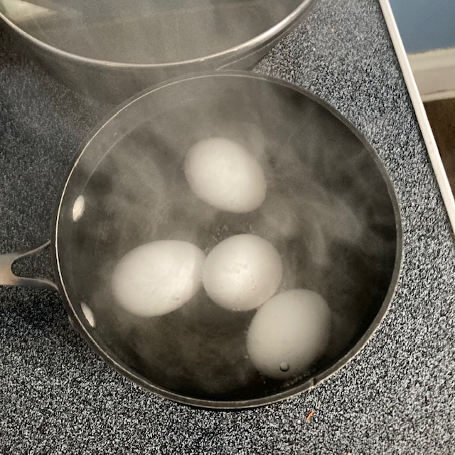 - Boil a pot of water and add in 4 of the eggs without cracking them.