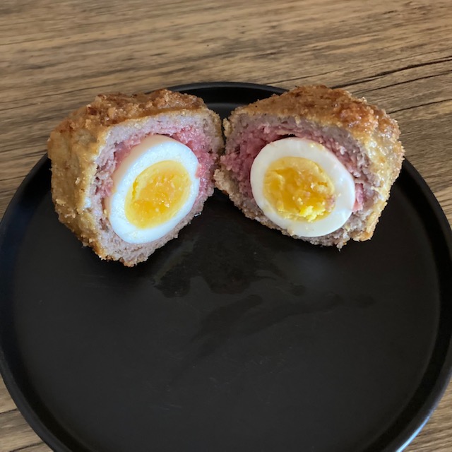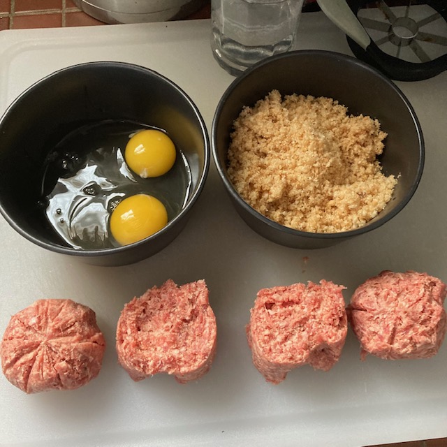 - Roll the sausage eggs in the pork crumble then the egg and finally back in the pork crumble a second time.