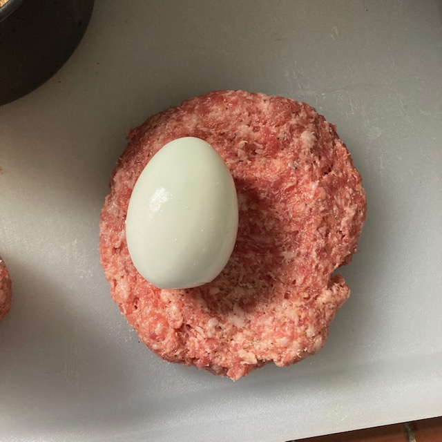 - Now wrap each of the 4 hard-boiled eggs in sausage.
