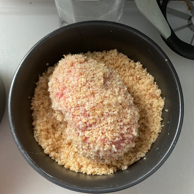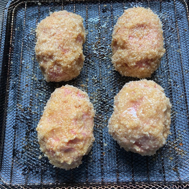 - Set each now pork-crumbled-covered egg on the air fryer basket.