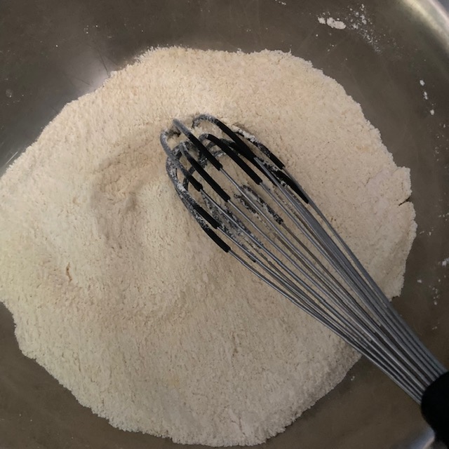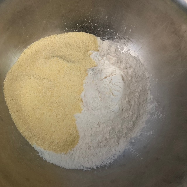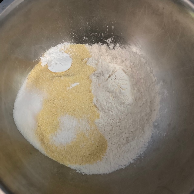 - In a large bowl whisk the cornmeal, baking powder, flour, sugar, & salt together.
