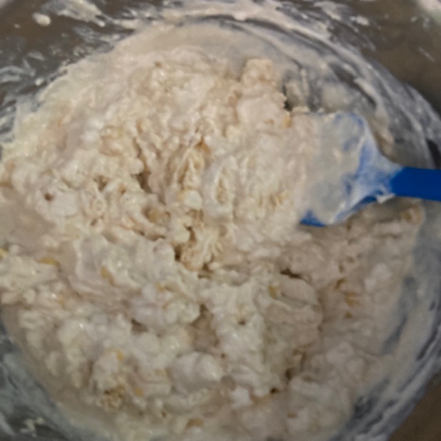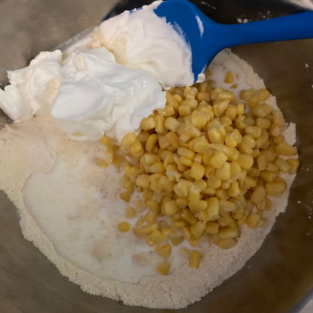 - Add in the Corn, Milk, & Sour Cream. Stir to combine.
