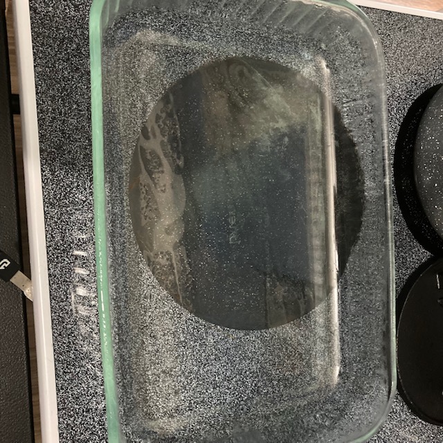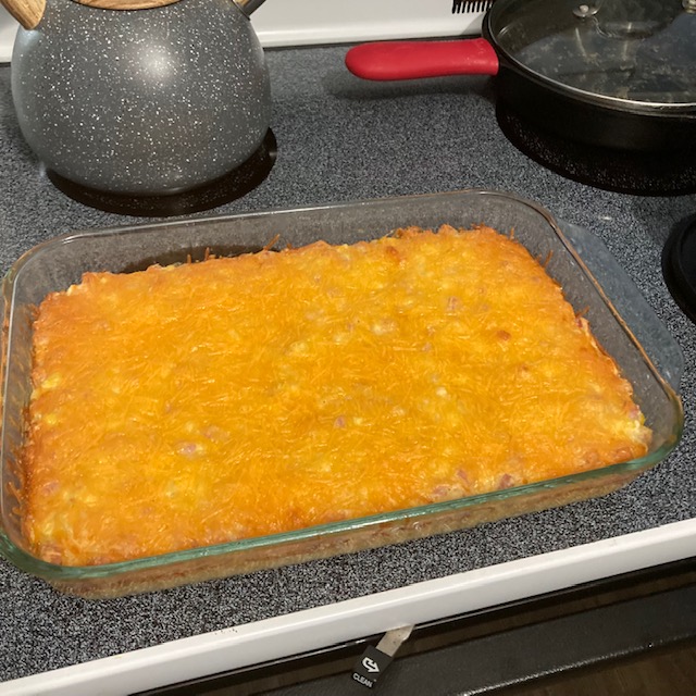 - Pour the large bowl contents into the 9 by 13 baking dish and spread evenly into the baking dish.