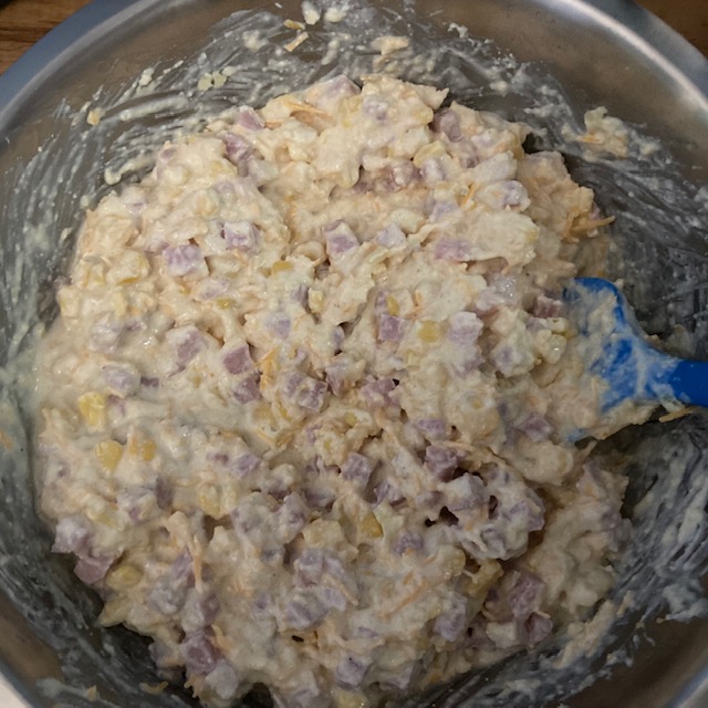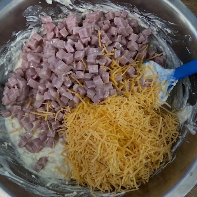 - Add the butter, ham, and half of the cheese to the large bowl. Stir to combine.