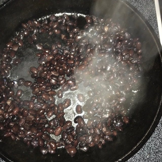 - Keep the skillet warm and add in half of the Black Beans.