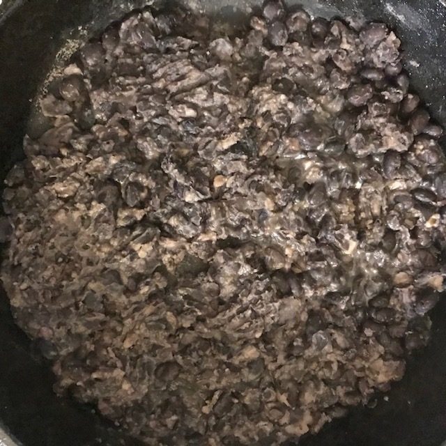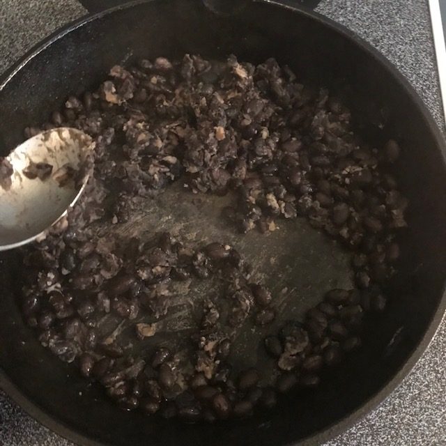 - Start to crush those black beans as they cook with the back of a spoon, As you smash these up you will add in a little lime juice and the ¼ cup of water to make a black bean paste.