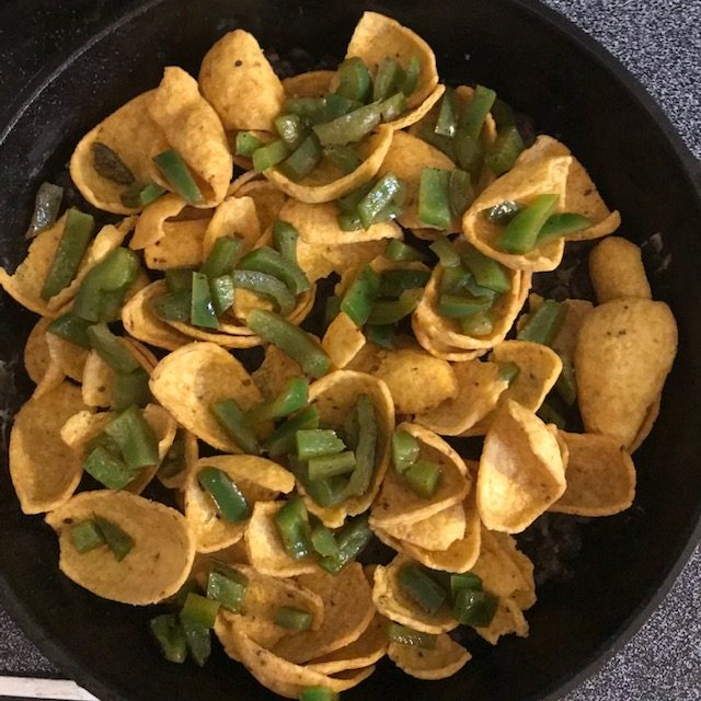 Corn Chip Skillet Nachos are one of my favorite appetizers. Now what you need is a skillet that is oven ready. I of course use a Cast Iron Skillet! If you want to pick one up hit up this link to my shop. Now I recommend the Frito Scoop Corn Chips as they are great for well scooping up all the nacho toppings and cheese! The other great thing about corn chips is that they tend to hold up better than your tortilla chip. I do love me a tortilla chip for salsa and for guacamole, but for a Nacho appetizer that you pile on the toppings they just don’t hold up as well as a corn chip. The Tortilla chip tends to break and get soggy while the Corn Chip just holds up and keeps its crunch! A do a couple of small things that add flavor and make these Corn Chip Skillet Nachos taste just awesome. The Bell Pepper preparation and the Black Beans are the real stars of this appetizer! They bring the flavor! Now let’s get into these Corn Chip Skillet Nachos!