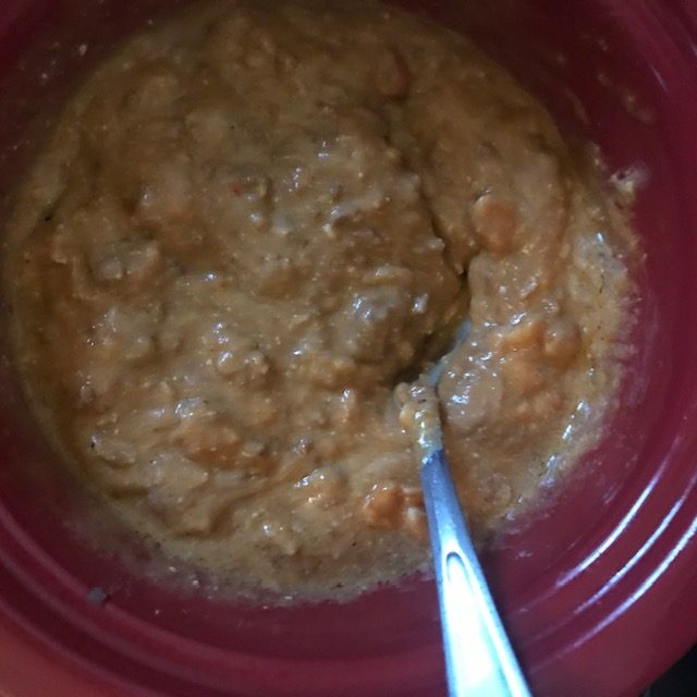- Once the beans are a nice paste add in the remaining beans and turn the heat off. Now you will add in about half or a little more of the corn chips. Save the rest of the Chips for scooping later.