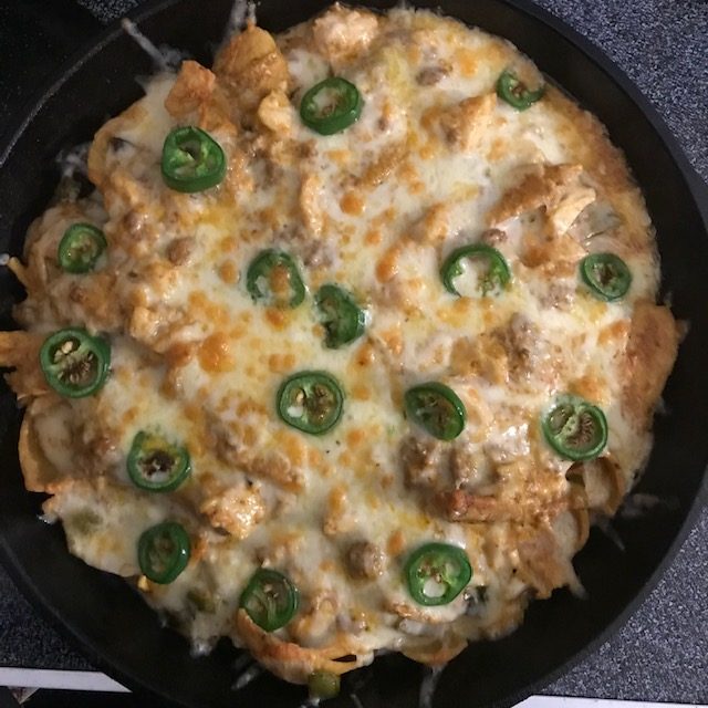 - In a pot, you can heat up the chili and about half of the cheese. Let that melt together and then add this as the next layer in the Skillet.