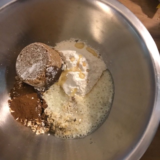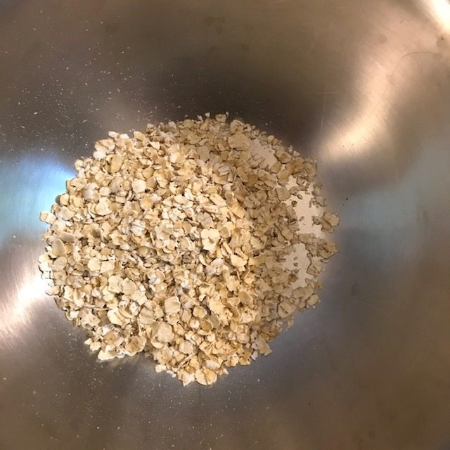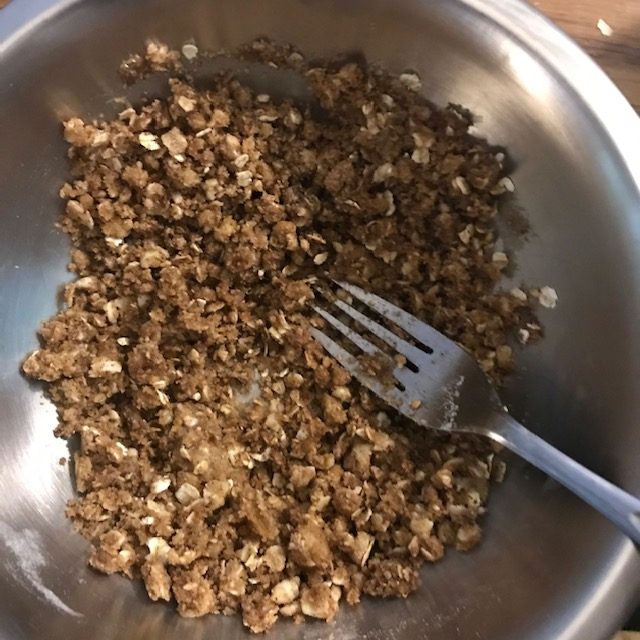 - In another bowl mix up the Toppings. The Quick Oats, Flour, Brown sugar, cinnamon, and melted butter go in the bowl.