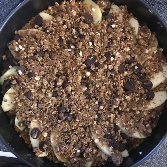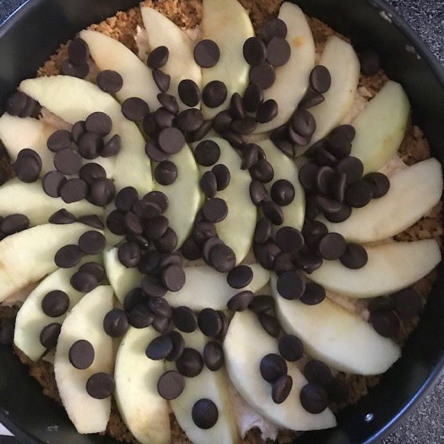 - Sprinkle the Dark Chocolate Chips over the apples as evenly as possible.