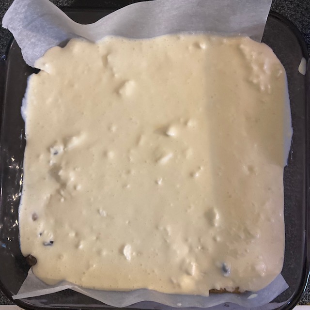 - The third layer is the cheesecake layer. Cover the chips with the cheesecake as evenly as possible.